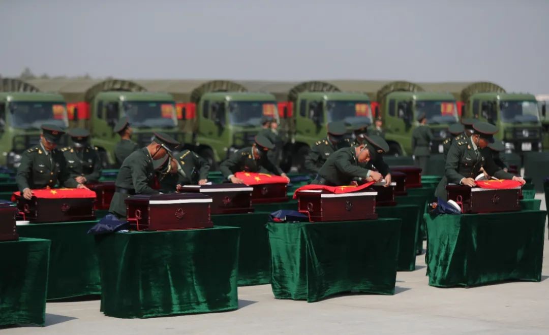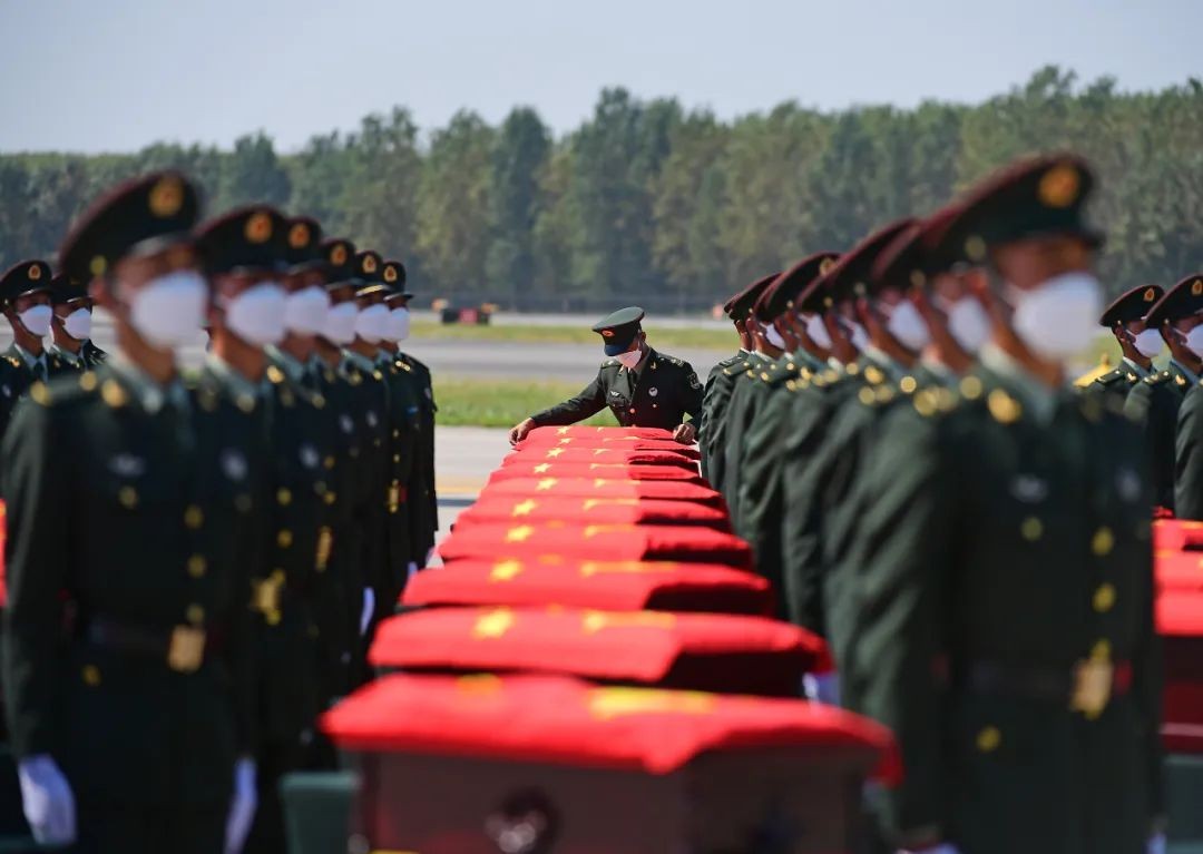 2020年9月27日,在沈阳桃仙国际机场,礼兵在殓放志愿军烈士遗骸的棺椁上盖上国旗。当日,第七批在韩中国人民志愿军烈士遗骸由中国空军专机护送从韩国接回辽宁沈阳。新华社记者 杨青 摄