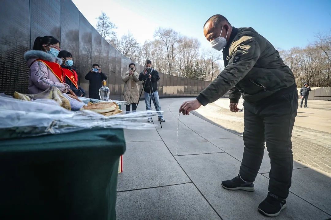 2022年3月5日,展志忠烈士的孙子展保成在沈阳抗美援朝烈士陵园英名墙前祭祀爷爷展志忠烈士。新华社记者 潘昱龙 摄