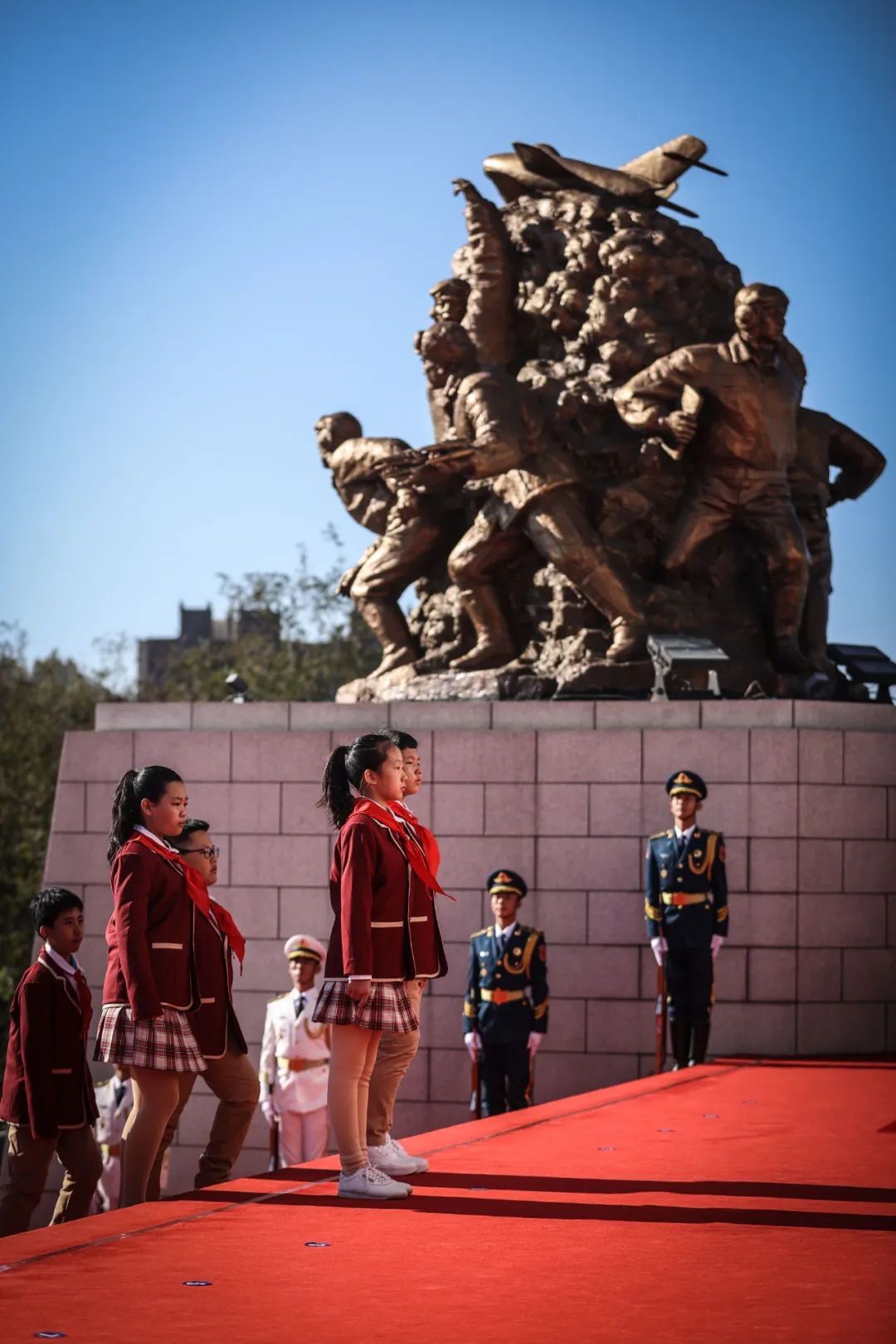 2020年10月23日,在丹东抗美援朝纪念塔敬献花篮仪式上,学生代表瞻仰丹东抗美援朝纪念塔。新华社记者 潘昱龙 摄
