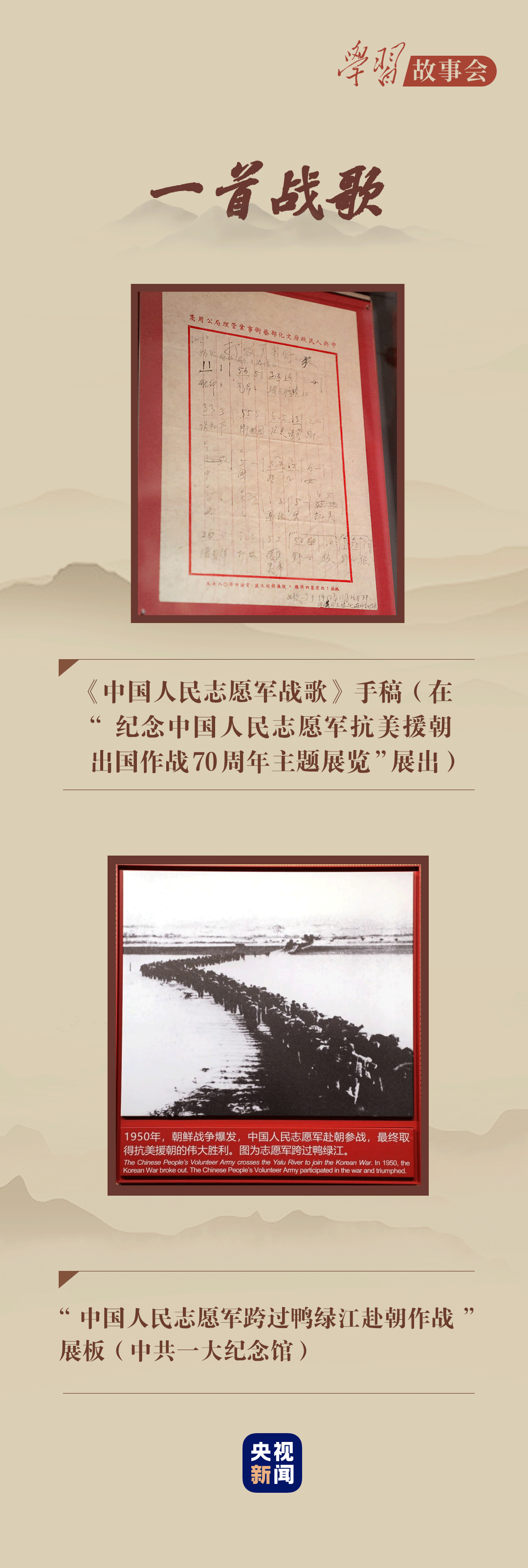 著名音乐家周巍峙在《人民日报》上看到这首诗歌后,仅用半个小时就谱出了曲子。犹如火把照亮前方的路,《中国人民志愿军战歌》自此响彻朝鲜战场。
