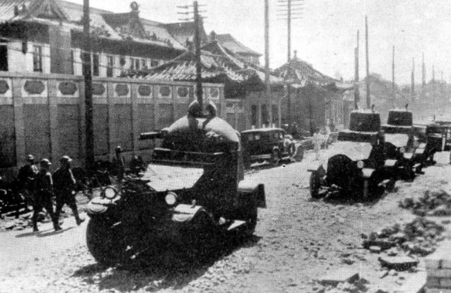 图为1931年9月19日,日本侵略军装甲部队侵入沈阳市。