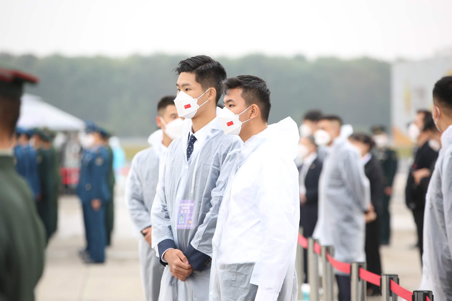 现场人员肃立雨中,接迎烈士回家。在志愿军老战士及烈士家属身后一排,两位来自香港的青年代表曲木之懿与姜霏梵满怀崇敬,静静地注视着礼兵战士将一具具烈士遗骸棺椁从机舱内抬出,每具棺椁上覆盖着的五星红旗格外鲜艳。