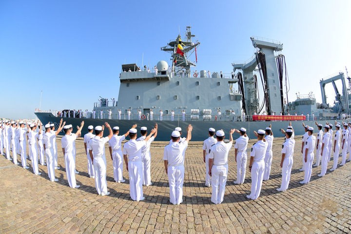 上午9时许,护航编队舰艇缓缓驶离码头,任务官兵在甲板上整齐列队,挥手向祖国和亲人告别。