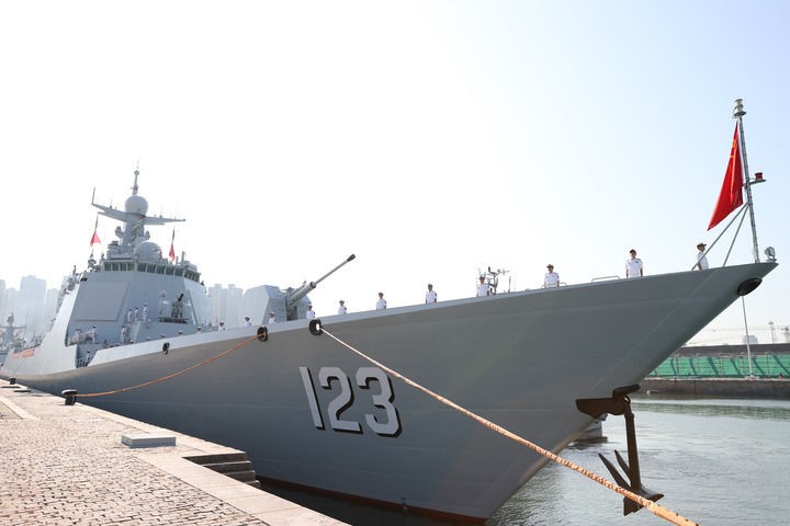 ↑9月21日,中国海军第42批护航编队从山东青岛某军港解缆起航。这是编队中的淮南舰。新华社发(马玉彬 摄)