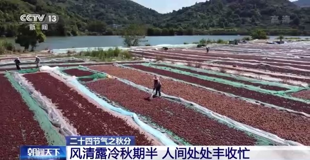 风清露冷秋期半,人间处处丰收忙。秋分时节,虽然气温逐渐降低,天气慢慢转凉,但也意味着收获满满、瓜果飘香的丰收时节已经来临。秋色像调色板一样浓缩在黄、红色调之中,稻穗、菊花、橘子、辣椒、柿子、枫叶,编织出一幅幅色彩绚丽的丰收秋景图。2018年国家把秋分定为“中国农民丰收节”。
