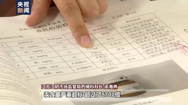 江苏江阴市场监管局药械科科长 承海燕:经检测,夜用巩固霜汞含量严重超标,超过了5700倍。这个检测结果与消费者自行送检的结果是一致的。