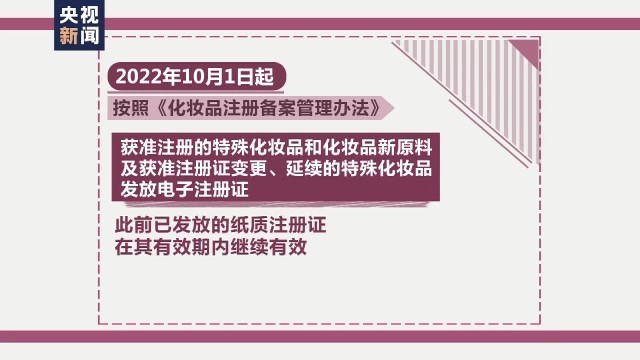 而在注册备案环节,监管措施也在不断优化。国家药品监督管理局近日发布公告称,自今年10月1日起,按照《化妆品注册备案管理办法》获准注册的特殊化妆品和化妆品新原料,及获准注册证变更、延续的特殊化妆品,发放电子注册证。此前已发放的纸质注册证在其有效期内继续有效。专家表示,电子注册证的实施将更有利于提高化妆品上市效率,也将有利于相关监管部门之间备查互认。而消费者也可以通过多种渠道查询相关化妆品的注册备案信息。