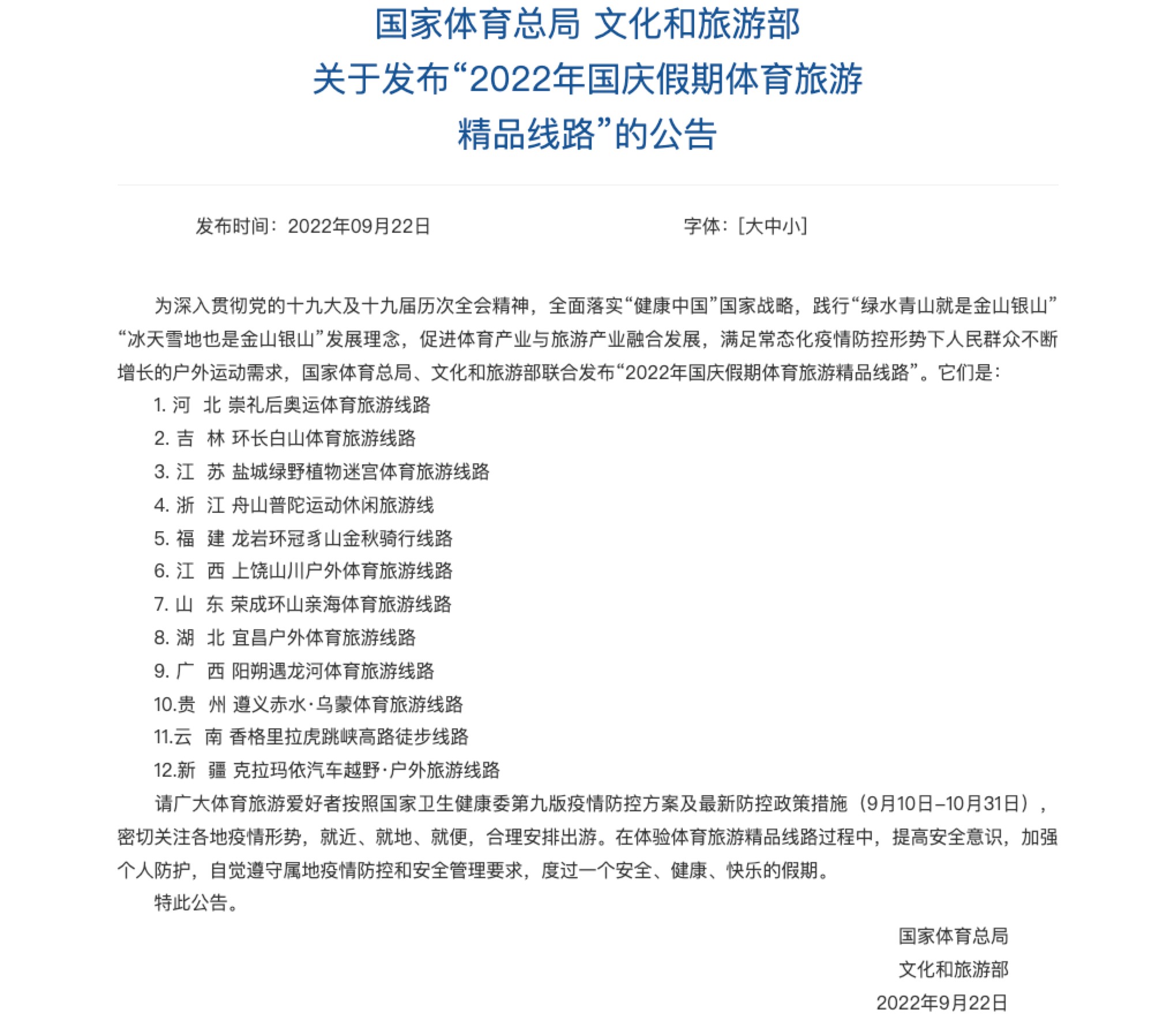 日前,国家体育总局、文化和旅游部联合发布“2022年国庆假期体育旅游精品线路”。最新的线路在哪里,它们拥有怎样的魅力和特色,如何让体育旅游成为拉动旅游发展的新热点。
