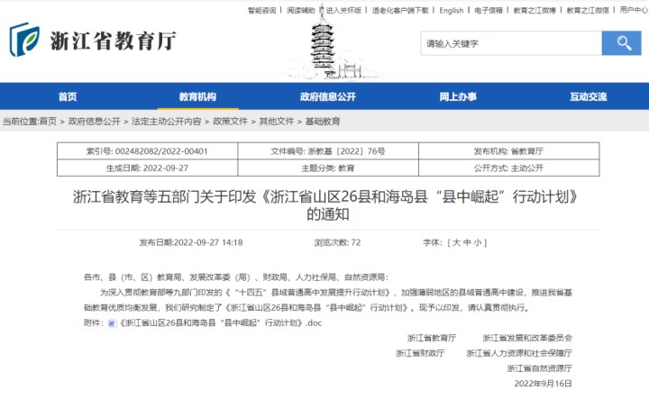 为贯彻落实党中央、国务院决策部署和教育部等九部门印发的《“十四五”县域普通高中发展提升行动计划》,更好地适应高考综合改革和推进育人方式改革,促进浙江省山区26县和海岛县普通高中(指山区26县和海岛县人民政府举办的公办普通高中,以下简称县中)高质量发展,助力乡村振兴,打造社会全面进步高地,推进“两个先行”,结合普通高中办学实际,日前,浙江省教育厅等五部门印发《浙江省山区26县和海岛县“县中崛起”行动计划》。