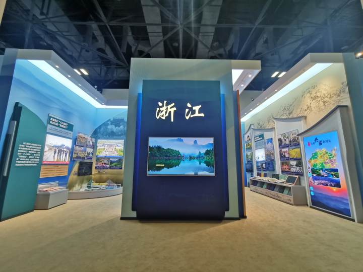 浙江展区位于12号馆,紧邻上海、江苏、安徽和福建。整个展厅以蓝色为主色调,紧扣“奋进新时代”主题,设计了6个部分。分别为“忠实践行‘八八战略’ 奋力打造‘重要窗口’”“数字化改革引领系统性大变革”“跳出浙江发展浙江”“绿水青山就是金山银山”“一体推进平安浙江法治浙江建设”“高质量发展建设共同富裕示范区”。