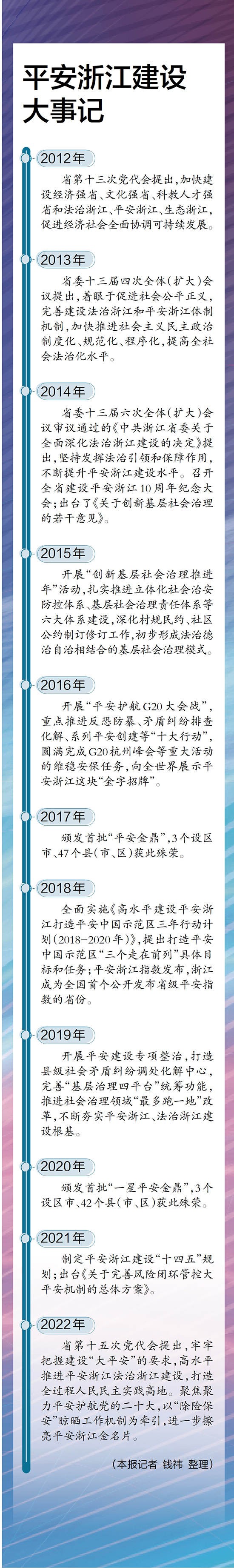 涵盖经济、政治、文化和社会各方面宽领域、大范围、多层面的“大平安”,有力守护着浙江经济社会的稳定快速发展、人民群众的安居乐业。