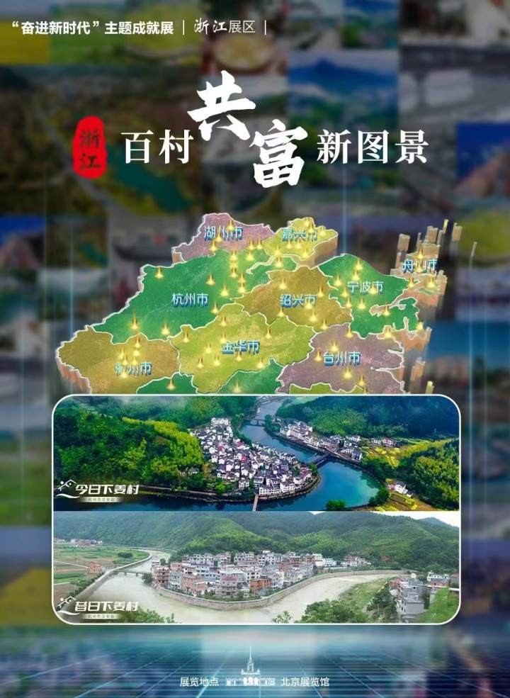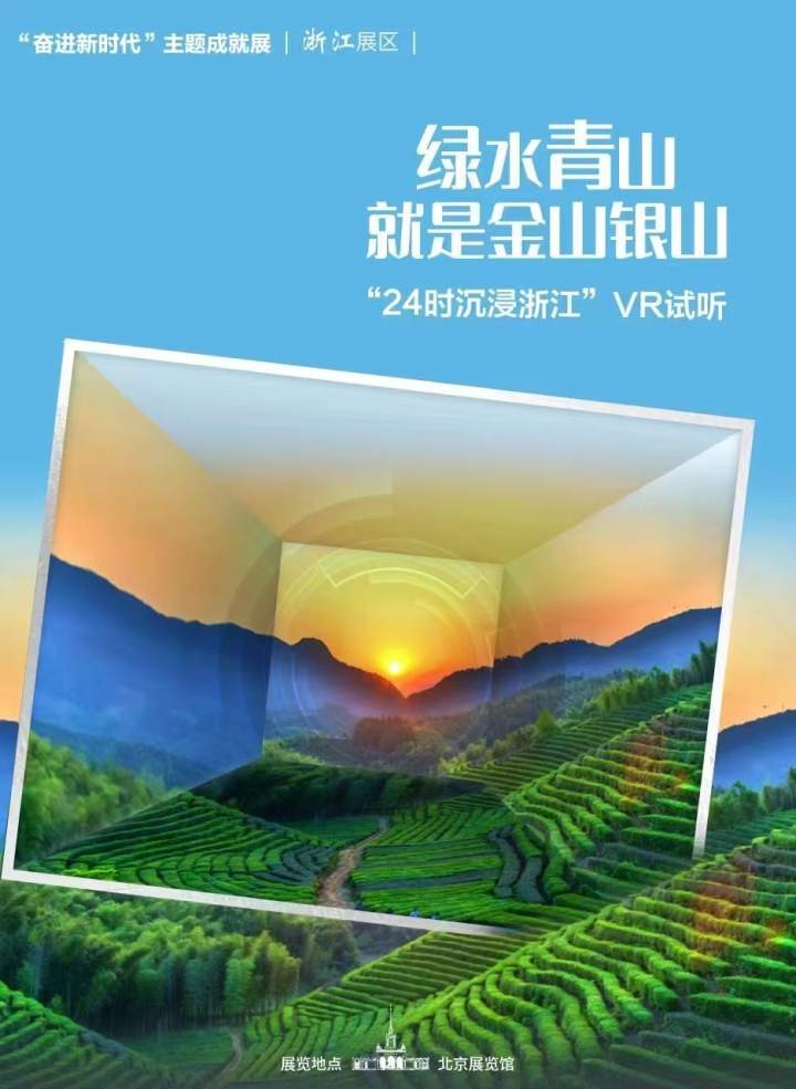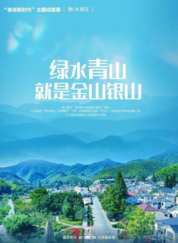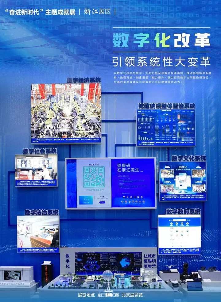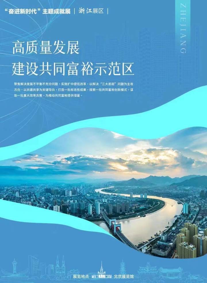 浙江展区位于12号馆。整个展厅以蓝色为主色调,紧扣“奋进新时代”主题,设计了6个部分。分别为“忠实践行‘八八战略’ 奋力打造‘重要窗口’”“数字化改革引领系统性大变革”“跳出浙江发展浙江”“绿水青山就是金山银山”“一体推进平安浙江法治浙江建设”“高质量发展建设共同富裕示范区”。