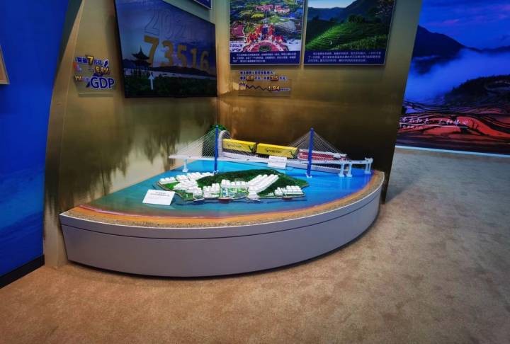 浙江展区精心挑选展出图片139余幅(件),拍摄制作“诗画江南、活力浙江”“数说浙十年”等视频60余个,大型沉浸式空间1个,实物(模型)20余个,还制作了“数字化改革”“浙江百村共富新图景”等5个沙盘和互动展项。