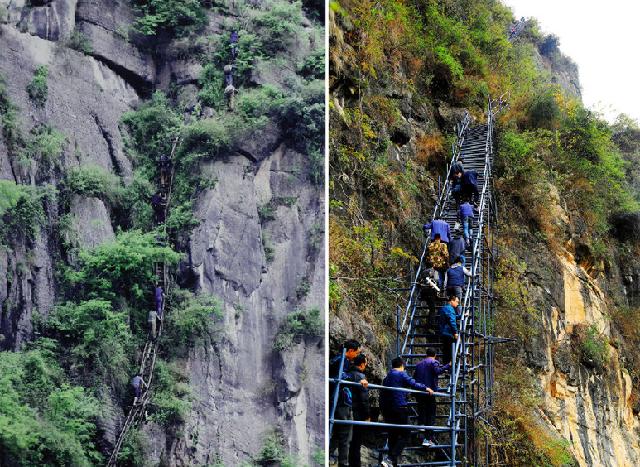 左边这张,一架藤梯悬挂在近乎直上直下的峭壁上