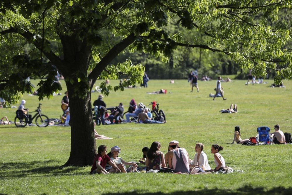 2021年5月14日,人们在美国纽约中央公园休闲。新华社记者王迎摄