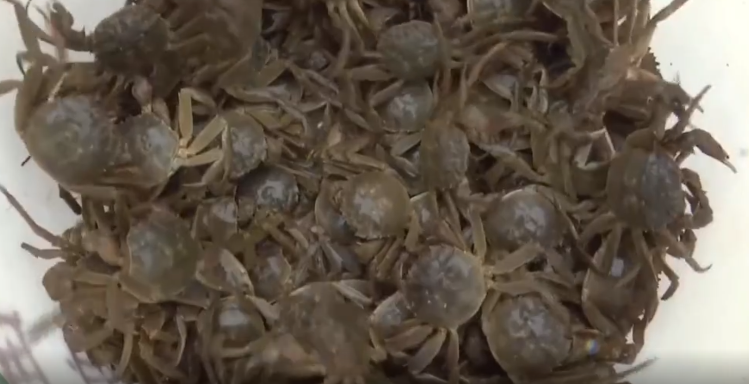 大伙正忙着回收前一晚放在稻田中的地笼,里面已经装满了大大小小的螃蟹,收起来后会立即打包,发往本地市场销售。