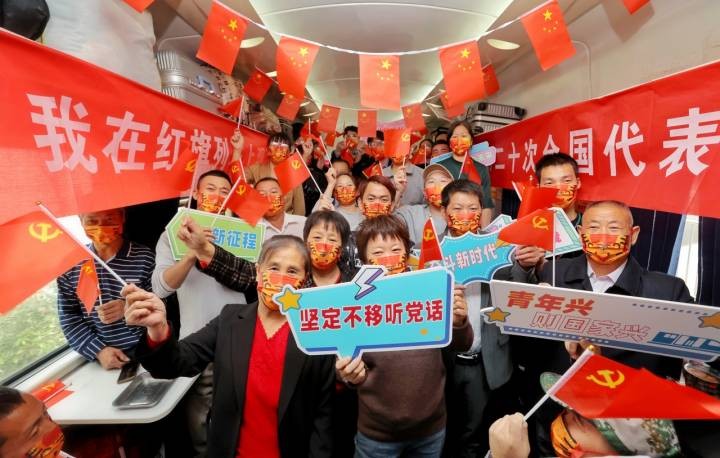 10月16日,在广州至宁波的K210次列车上,中国铁路上海局集团有限公司杭州客运段甬广车队开展“我在红旗列车上观盛会”主题活动,车队队员与旅客们一起收看盛会。浙江新闻客户端通讯员 周围 摄