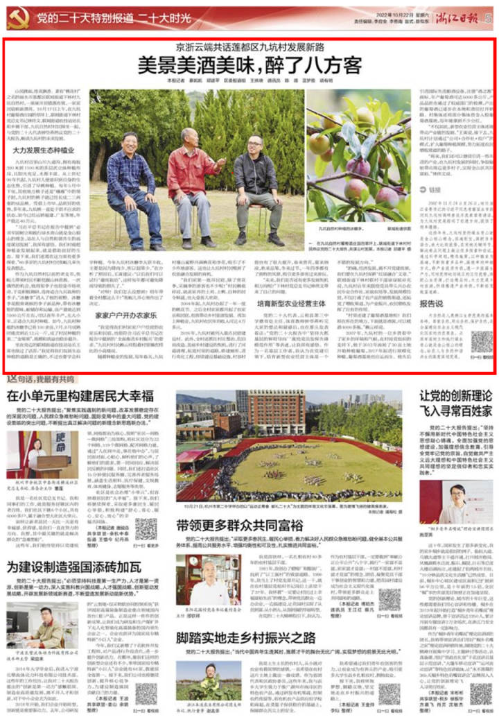 山风拂面,桂花飘香。素有“桃花村”之名的丽水市莲都区联城街道下林村九坑自然村,一座座洋房错落有致,一家家民宿崭新漂亮。10月17日上午,在九坑村葡萄酒庄园的草坪上,联城街道下林村党总支书记林伟文、联城街道农技站站长和乡镇干部、九坑自然村村民围坐一起,与党的二十大代表钟华燕热议党的二十大报告,畅谈九坑村的未来发展。