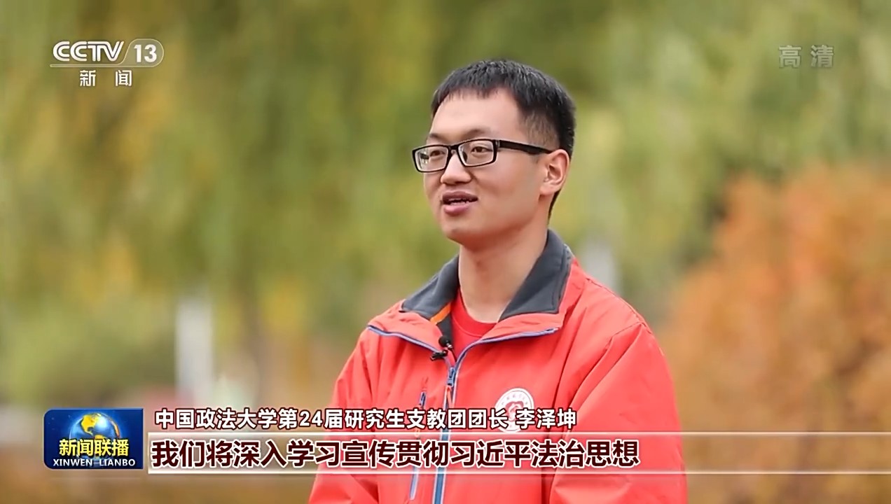 中国政法大学第24届研究生支教团团长 李泽坤:习近平总书记指出,要努力使尊法、学法、守法、用法在全社会蔚然成风。我们将深入学习宣传贯彻习近平法治思想,加大对宪法、民法典等法律法规的宣传力度,为国家基层法治建设贡献青春力量。