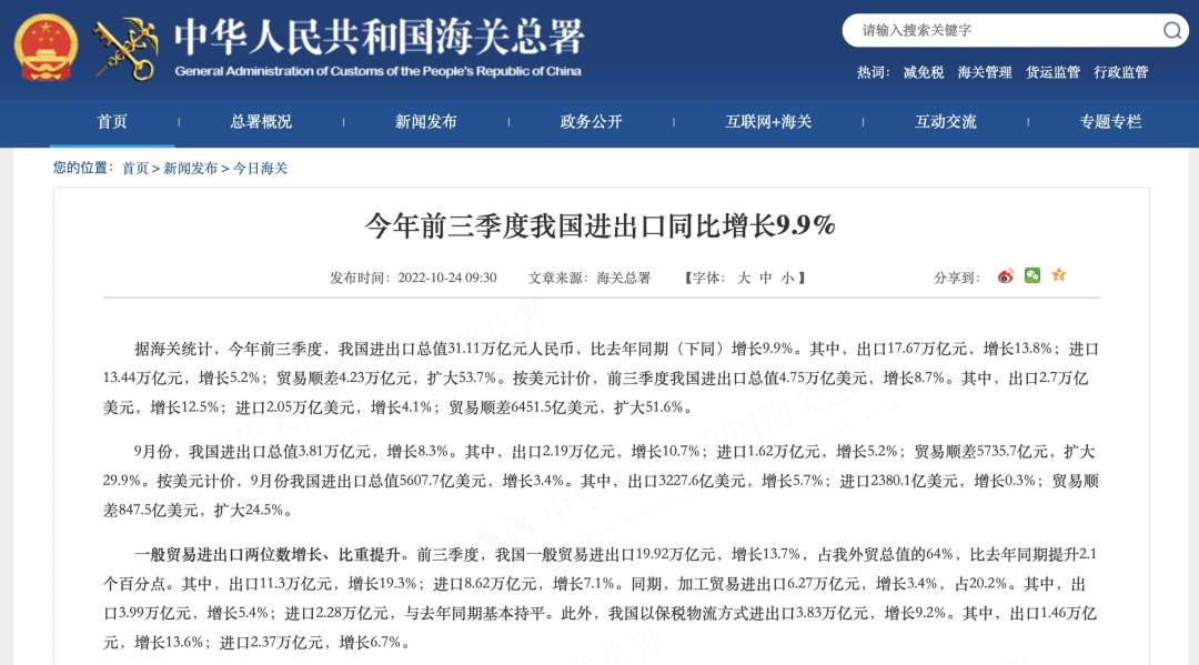 9月份,我国进出口总值3.81万亿元,增长8.3%。其中,出口2.19万亿元,增长10.7%;进口1.62万亿元,增长5.2%;贸易顺差5735.7亿元,扩大29.9%。按美元计价,9月份我国进出口总值5607.7亿美元,增长3.4%。其中,出口3227.6亿美元,增长5.7%;进口2380.1亿美元,增长0.3%;贸易顺差847.5亿美元,扩大24.5%。