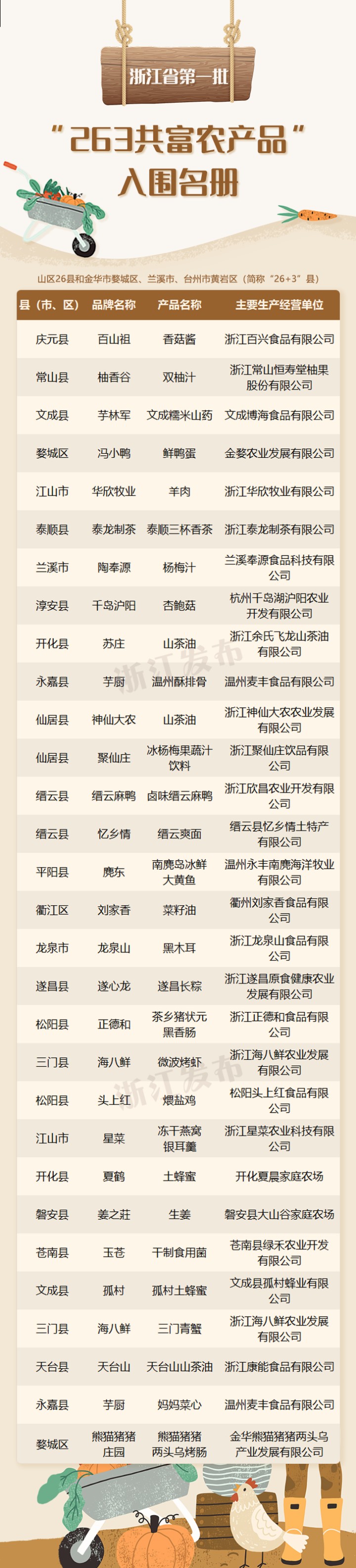 为推进山区26县农(副)产品销售,促进农业产业高质量发展,近日,浙江省乡村振兴局公布了30个农(副)产品为浙江省第一批“263共富农产品”。一起来看看,有你家乡的吗?