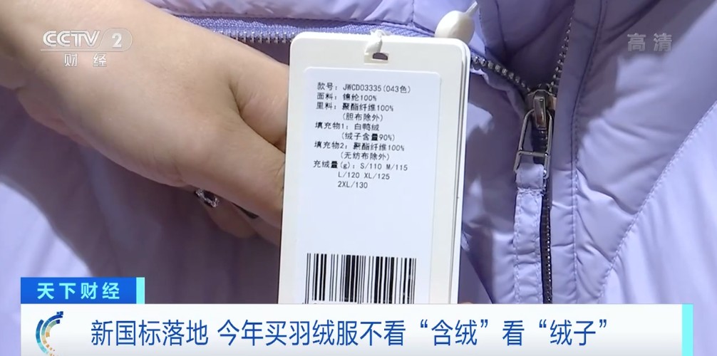 记者来到江苏南京新街口商业区,销售人员介绍,十月下旬,羽绒服销量逐步上升。今年4月起,羽绒新国标正式实施,最大亮点是把“含绒量”修改为“绒子含量”。记者翻看了一件羽绒服的吊牌,吊牌上已经没有“含绒量”的标注。