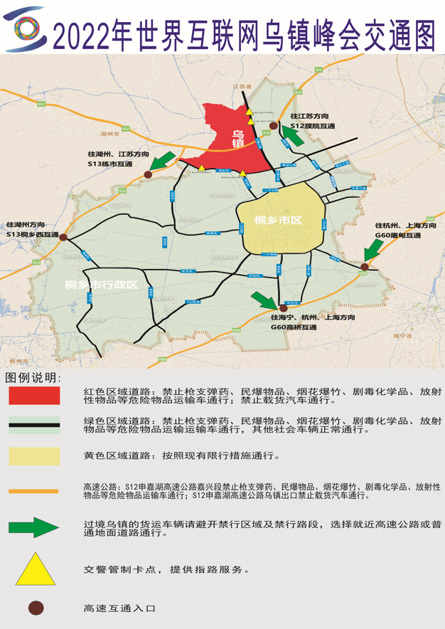 二、2022年11月6日0时至11月11日18时,桐乡市乌镇大道-嘉湖公路-湖盐公路-运河合围区域内的普通道路(不含上述道路)、S12申嘉湖高速公路乌镇出口禁止载货汽车通行。