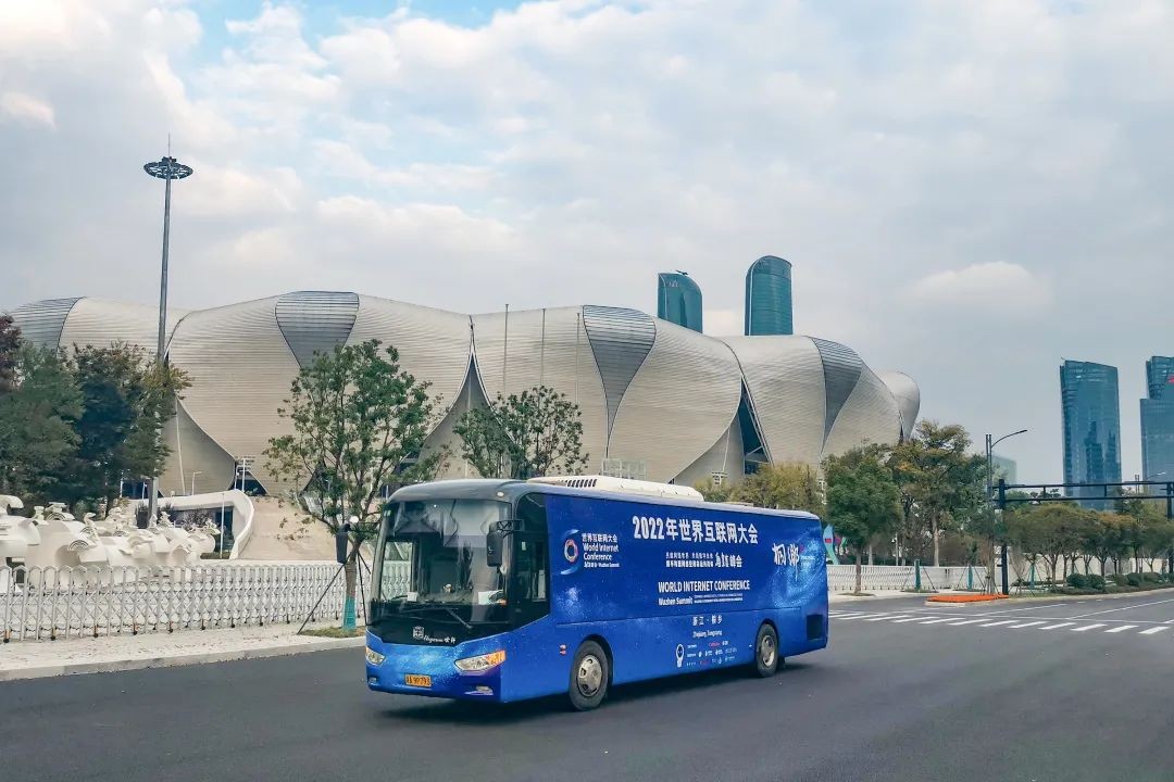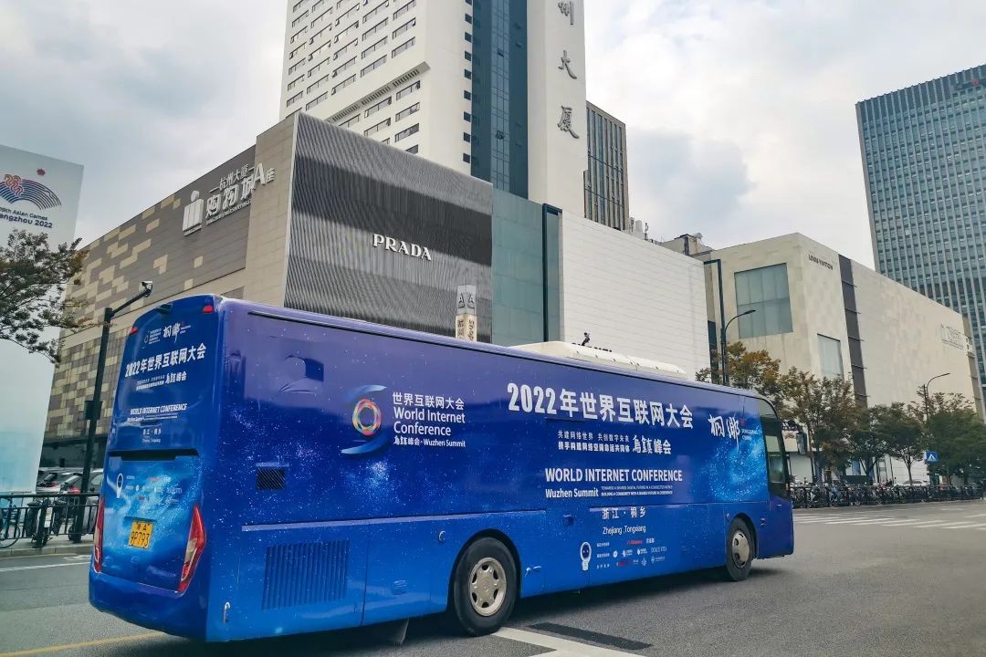 值得一提的是,今年还有三辆网红大巴穿梭在上海、杭州、广州的大街小巷,共同预告2022年世界互联网大会乌镇峰会的召开。