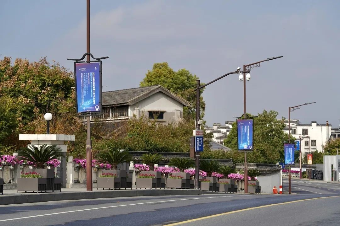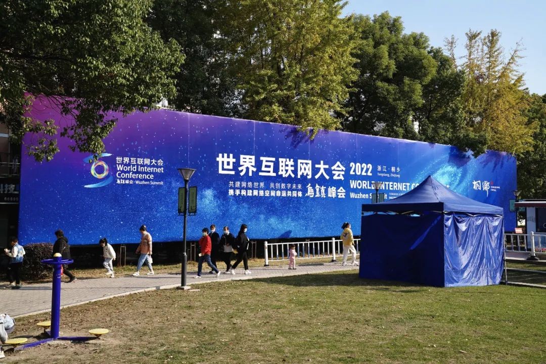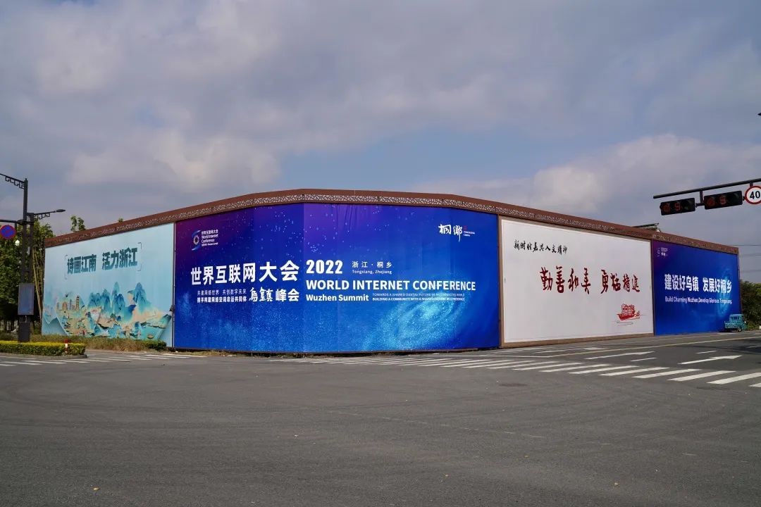 沿着市区振兴路、庆丰路和乌镇大道一路往北,印着“2022年世界互联网大会乌镇峰会”和“共建网络世界 共创数字未来 携手构建网络空间命运共同体”中英文字样的道旗夺人眼球。代表数字未来、网络世界的深蓝底色,让人还未抵达乌镇,就已经感受到扑面而来的互联网气息。
