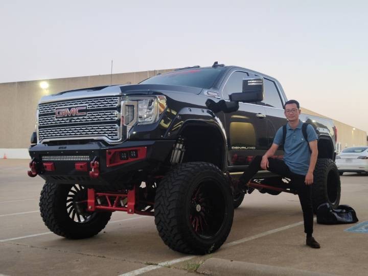 颜胜元站在客户的改装车前,车上的改装轮毂轮胎就是他们公司的产品。