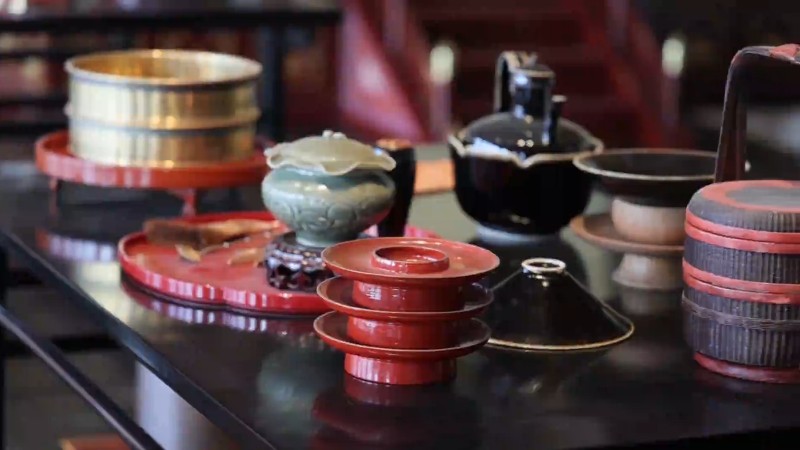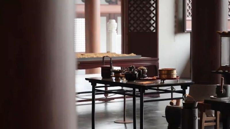 茶饮区摆满精致的御用茶具,可以想象出宋代皇帝和大臣在这里饮茶议事的历史场景。