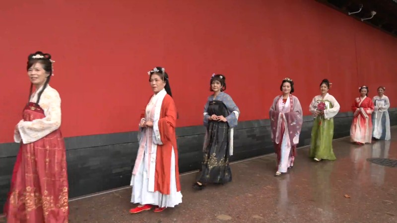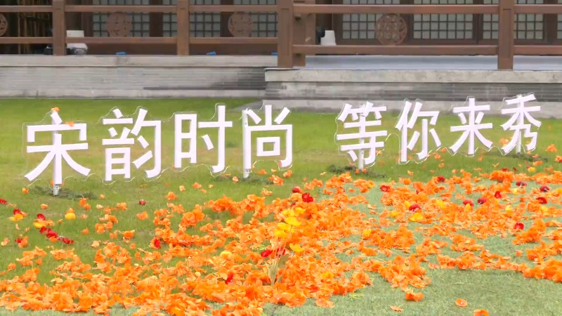 今天下午,在德寿宫的红墙前,身着宋代华服的模特队员们正在练习走秀,为今晚在慈福宫前举行的宋韵国风秀进行彩排。