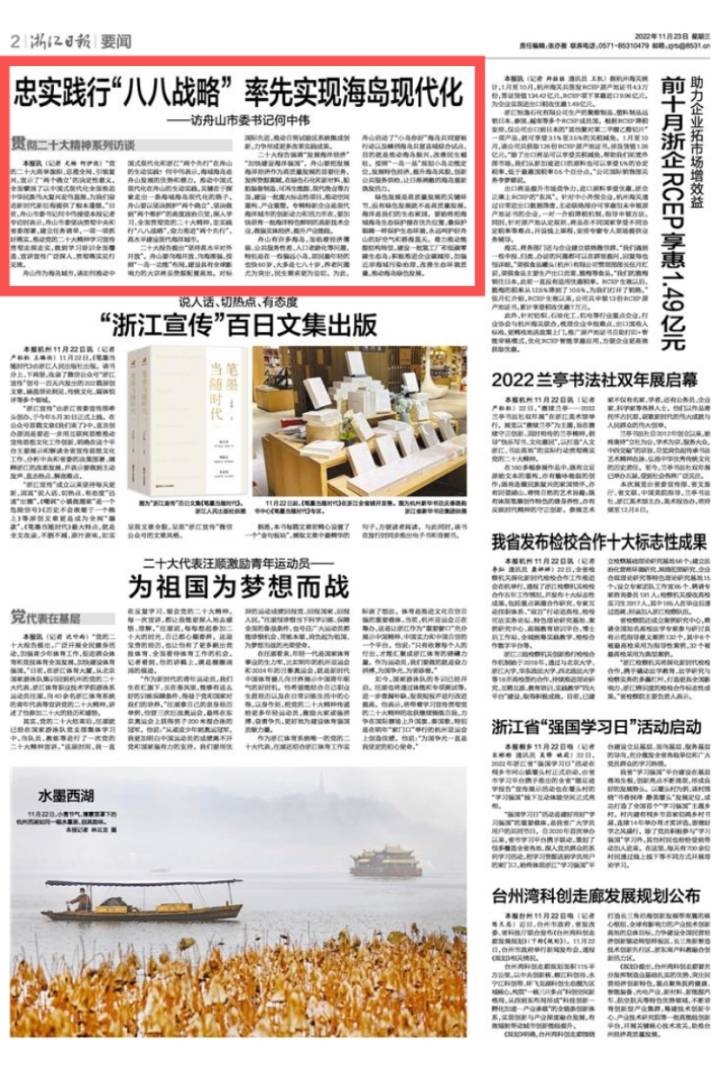 “党的二十大高举旗帜、总揽全局、引领复兴,宣示了‘两个确立’的决定性意义,全面擘画了以中国式现代化全面推进中华民族伟大复兴宏伟蓝图,为我们奋进新时代新征程提供了根本遵循。”日前,舟山市委书记何中伟接受本报记者专访时表示,舟山市委坚决贯彻中央和省委部署,建立任务清单,一项一项抓好落实,推动党的二十大精神学习宣传贯彻走深走实,做到学习培训全面覆盖、宣讲宣传广泛深入、贯彻落实见行见效。