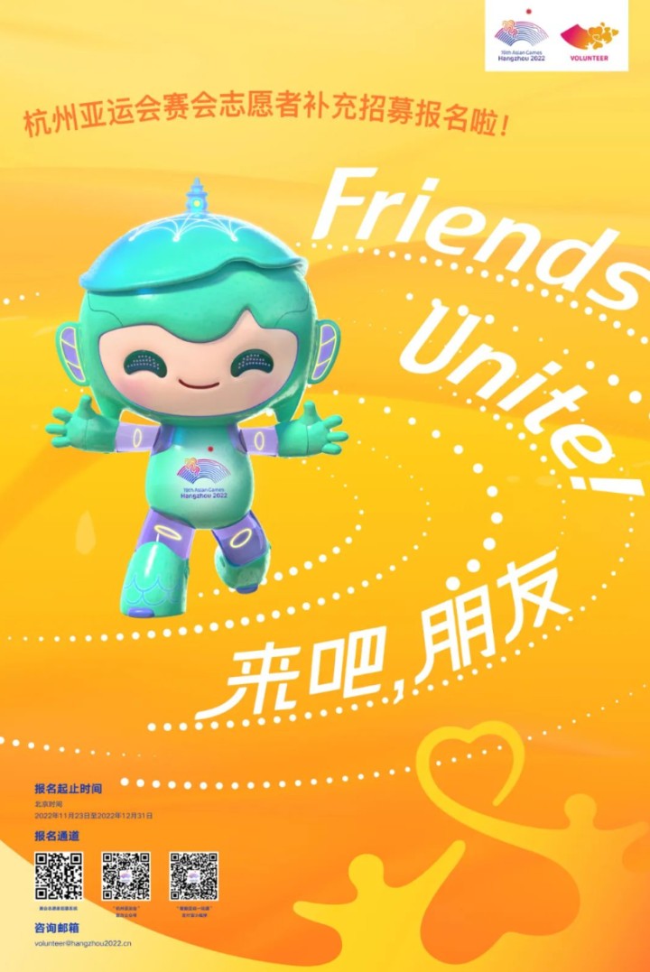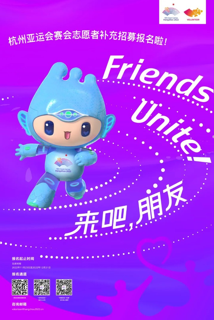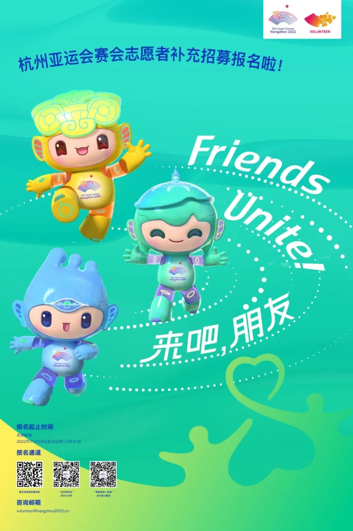 即日起至2022年12月31日,符合条件的申请人可以通过杭州亚运会官方网站(https://www.hangzhou2022.cn),或直接登录赛会志愿者招募系统(https://hangzhou2022.zyh365.com)进行注册报名,也可以通过“杭州亚运会”官方公众号、支付宝“智能亚运一站通”等渠道进行报名。