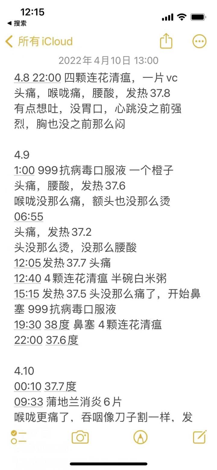 4月8日下午,我开始不舒服,觉得头痛、喉咙痛,晚上测温37.8℃发烧了。觉察到可能感染了新冠是因为腰酸,平常感冒不会有腰酸,那次就像下雨天风湿的感觉。体力也不好,胸闷,爬4楼会气喘,但也没有虚到走不了路,只是提不起精神。