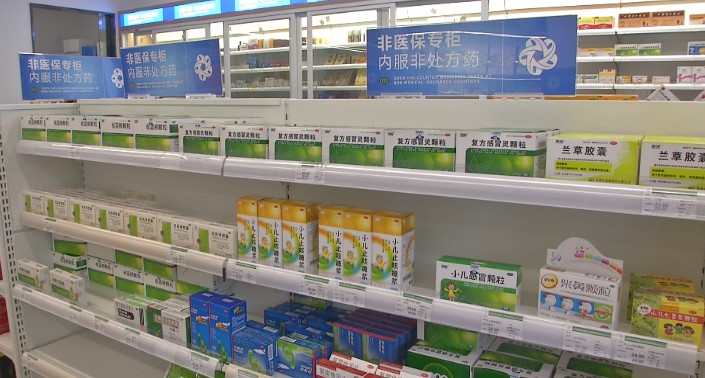 药店货架上的“四类”药品挺齐全,其中感冒用药销量较大,现场不少市民正在选购。