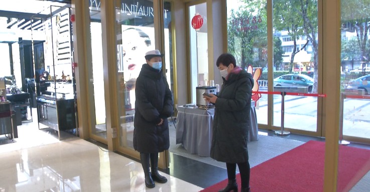 在宁波的来福士广场内,志愿者们正在提醒大家佩戴口罩。进入商场前,只需出示绿码,测量体温即可。