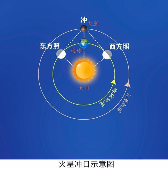 火星是地球的外行星,平均779天冲日一次。今年8月27日,火星“西方照”,即火星在太阳的西面,与太阳的角距恰好等于90度,火星视亮度为负0.1星等,适宜于下半夜(凌晨)观测。这天,地球、火星和太阳排成一个直角三角形,直角在地球处。在火星冲日示意图中,火星和地球的公转和自转的方向,都是逆时针的。12月8日,火星冲日,即火星与太阳的角距恰好等于180度,火星最明亮,视亮度达到负1.9星等,适宜于凌晨0时前后观测。明年3月17日,火星“东方照”,即火星在太阳的东面,与太阳的角距恰好等于90度,火星的视亮度为0.7星等,适宜于上半夜(晚上)观测。此后,火星距离地球越来越远,亮度稍逊。
