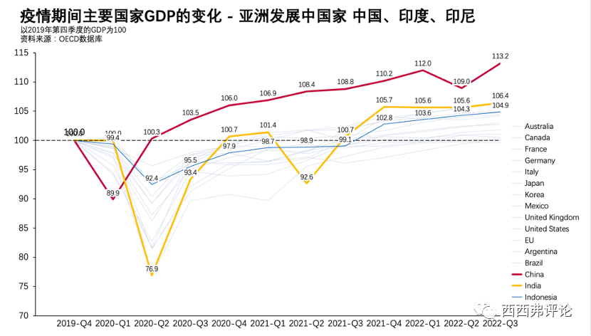 印度作为后起的发展中国家,在疫情前,经济增速已经超过中国。但疫情这三年,中国扩大了和印度之间的差距。中国2022年三季度,GDP是2019年四季度的113.2%,印度则只是106.4%。