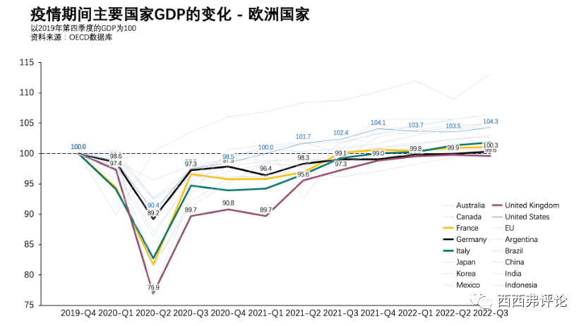 英法德意四个欧洲国家,从2019年四季度到2022年三季度,经济基本上原地踏步。