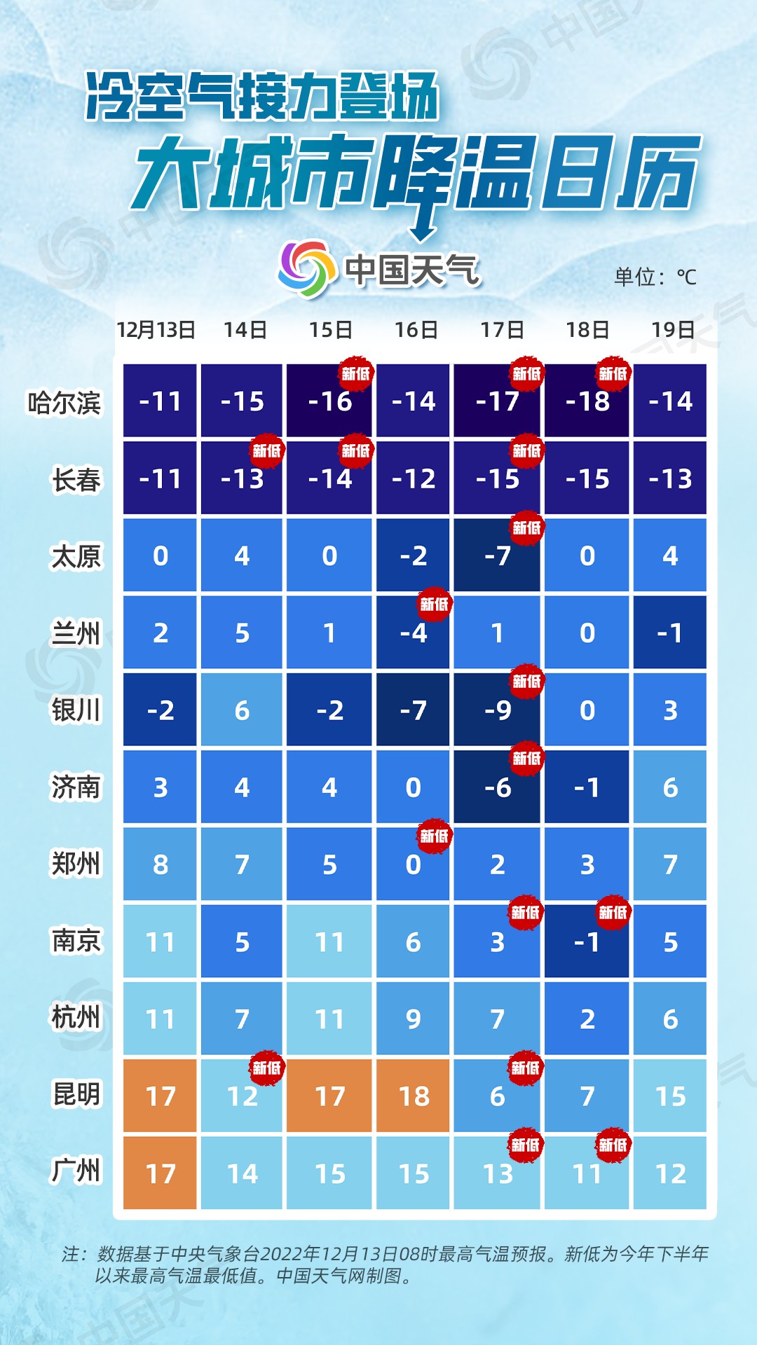 本周两股冷空气接连影响我国,冷上加冷。除了目前正在影响我国的双十二冷空气,一股实力更强的冷空气蓄势待发,它将于12月15日至18日影响我国大部,降温影响直达华南、云南一带,南方多地最低气温或可破极值,冷过11月底的寒潮。中国天气网推出大城市降温日历,快来看看你家气温何时降到低点,请大家及时备好保暖衣物,谨防感冒。