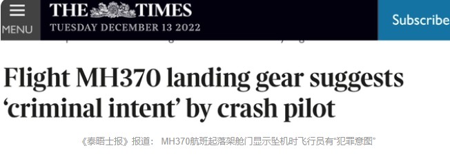 英国《泰晤士报》12日援引一份最新分析内容称,2014年失联的马航MH370上一名飞行员可能在飞机飞行的最后几秒钟放下了飞机起落架。报道说,这表明“世界上最大空难谜团之一”背后可能存在犯罪意图。