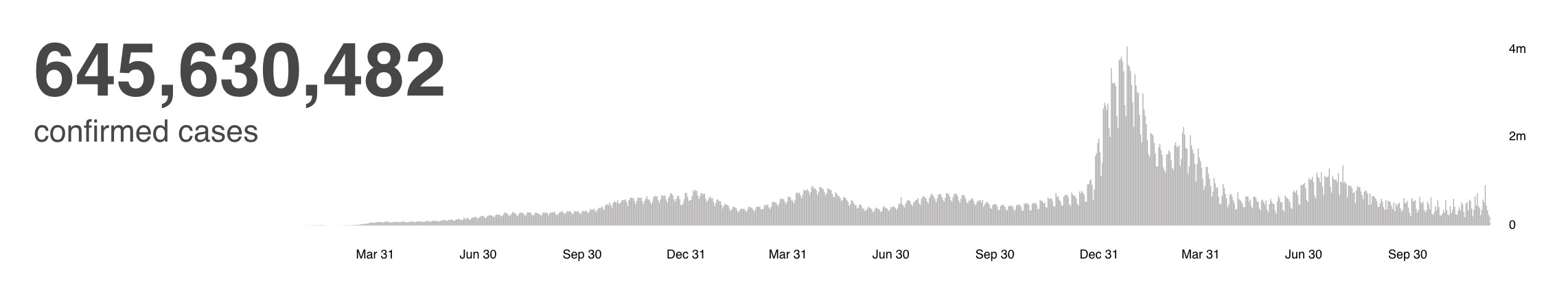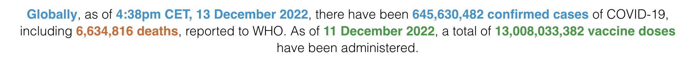 根据世卫组织最新实时统计数据,截至欧洲中部时间12月13日16时38分(北京时间12月13日23时38分),全球累计新冠肺炎确诊病例645630482例,累计死亡病例6634816例。13日全球新增新冠肺炎确诊病例192915例,新增死亡病例645例。