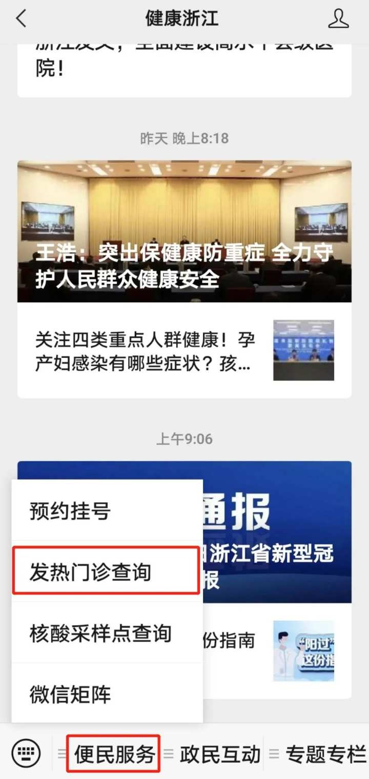 路径:打开“健康浙江”微信公众号—便民服务—发热门诊查询