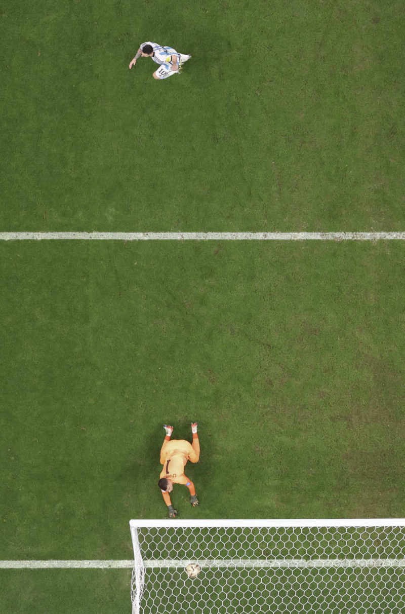 12月13日,克罗地亚队守门员利瓦科维奇(下)在比赛中未能扑出梅西主罚的点球。新华社记者徐子鉴摄