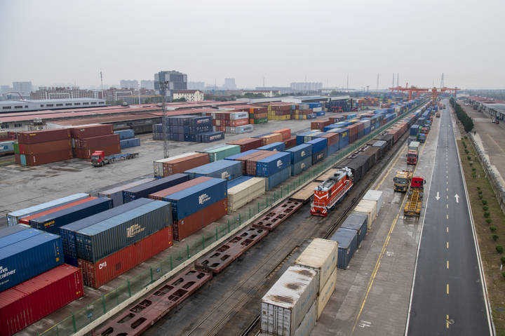 12月7日,满载100个标箱的“义新欧”中欧班列从义乌铁路口岸发车,驶往中亚五国。共享联盟·金华 胡肖飞 摄