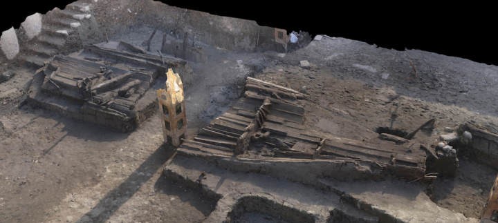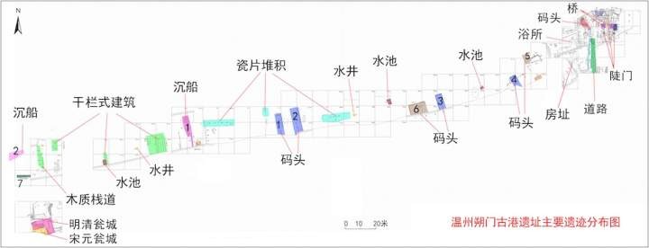 发掘区东西两端分别为水、陆城门相关遗迹,当中主体呈东西向条带状,沉船、码头等遗迹多分布于带状区。码头遗址除1座北宋斜坡式码头外,呈多级月台状。斜坡式码头依托海坛山脚基岩而建,用块石砌筑而成,呈平缓斜坡状。两宋时期的突堤式码头多建于江边滩涂,平面长方或长条形,石边土心结构,底部及缘用木桩打底和围护。宋代福船2艘。其中一艘残长12.4米,推测全长约20米。另一艘仍在发掘。官用栈道位于瓮城出城道路北面,做工规整。据相关史料,附近或即馆驿所在。元代浴所位于水门河西侧,以更衣室与沐浴室成组搭配,揭露的3组呈东西向布局,面积达100多平方米。