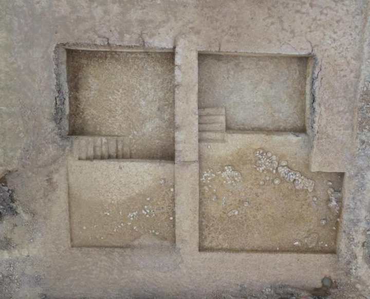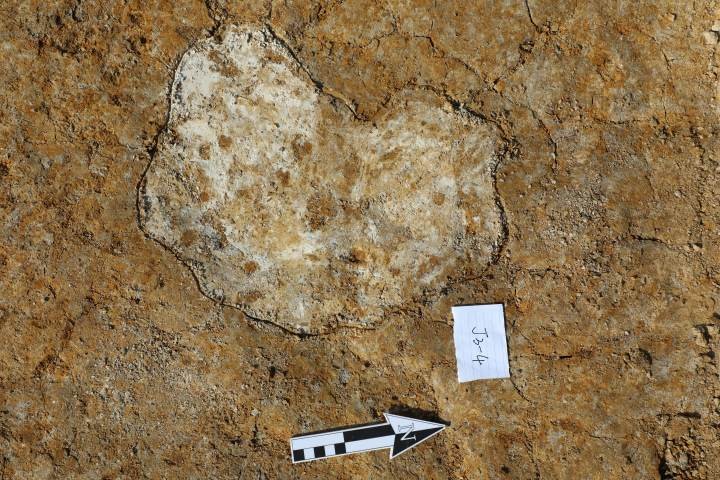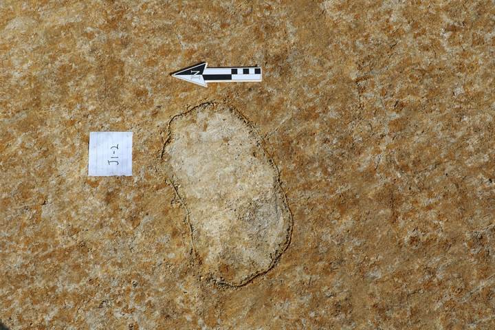 发掘区南部的上文化层中,发现由西向东的两排3组脚印。其中南排2组,东组J1计7个、西组J2及19个,可能为人类遗留的,总长度在24米左右,大部分步幅月80厘米。北排有J3计7个,肯能为大型哺乳动物遗留,总长度约10米。这些人类脚印,目前在国内旧石器时代非常少见,其年代晚于石构建筑遗迹的年代,它的发现,对研究人类行为具有重大意义。