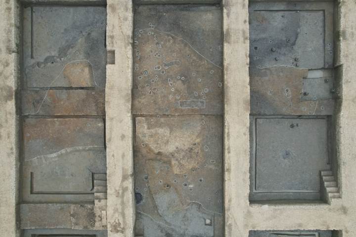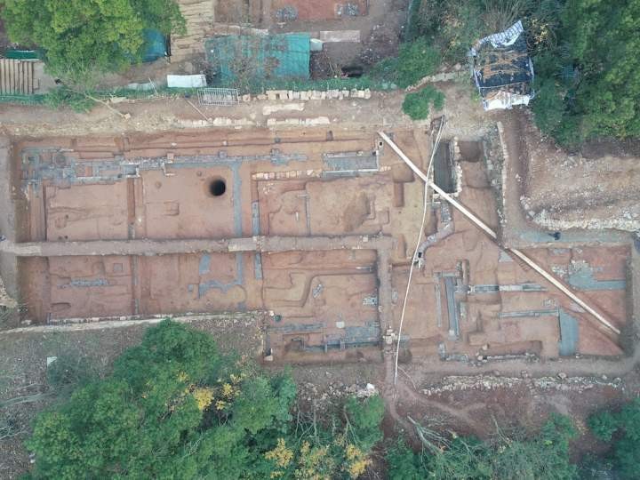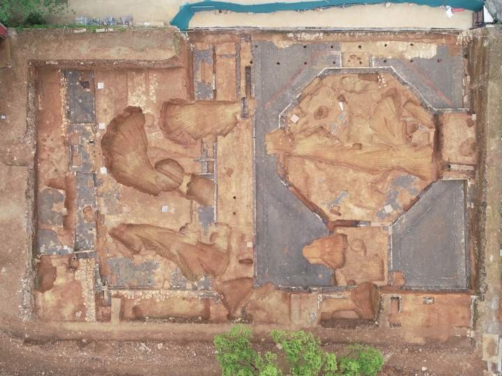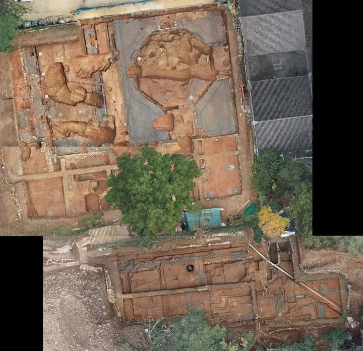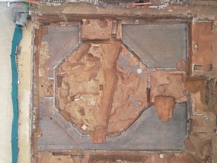 最为重要的是A地段发现的以八边形夯土台基为中心的大型建筑遗迹。该遗迹规模宏大,结构清晰,保存状况较好。整体呈长方形,坐南面北,方向北偏西7°,由八边形夯土台基、天井、连廊、踏步、散水、排水沟等组成。八边形夯土台基位于天井中心,将天井分割成四个面积相等的直角梯形。北侧设踏步,南侧与大型夯土台基相连,形成该组建筑的中轴线。天井东西两侧以廊庑合围,西侧廊庑以西发现厢房遗址,整体布局错落有致。根据地层和文献研究推测,该组建筑遗址与净慈寺的“应真殿”,又称五百罗汉堂,有密切的关系。