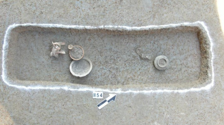 河姆渡文化四期的主要遗迹现象为干栏式建筑、土台、墓葬、灰坑、陶片堆等。土台为东-西走向,平面形状不太规则,长约20米,宽约10米。剖面中间厚两边薄,最厚处约0.45米。其上部发现一处干栏式建筑,由数十根木桩或木柱构成,大致呈西北-东南走向整齐分布。所揭露的墓葬大多位于土台之上及其周围,墓葬均为长方形竖穴浅坑墓,仰身直肢葬,头向东,葬具为独木棺。随葬品均位于脚端,陶豆和小陶釜为随葬品的标配,部分见有陶罐、石钺等。该时期出土陶器可辨器形主要为釜、鼎、豆、罐、钵等,石器见有锛、凿。